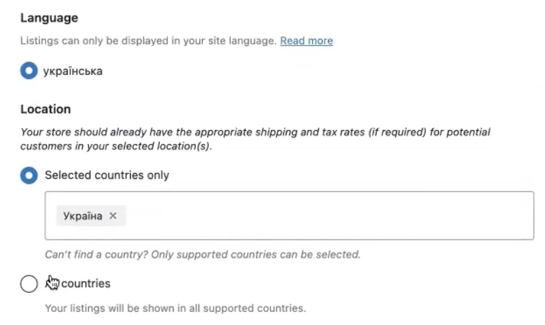 Дальше обязательно нужно выбрать язык (language), location Украина тут выбрана. Предлагает заполнить некоторые моменты, касающиеся доставки и прочих каких-то моментов, поэтому весь блок выбирается. Плюс создание рекламной кампании, потому что тут вшит функционал одновременного создания Перформанс макс.