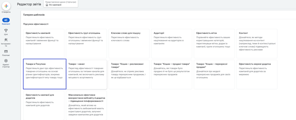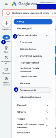 1. Заходимо в кабінет гугл адс. Переходимо в розділ Кампанії – Статистика і звіти – Редактор звітів