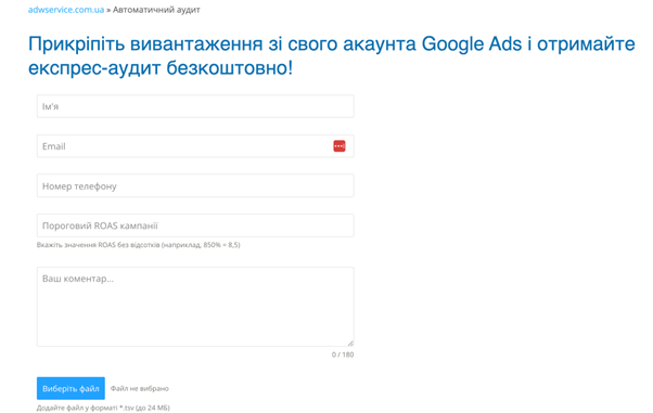 Прикріпіть вивантаження зі свого акаунта Google Ads і отримайте експрес-аудит безкоштовно!