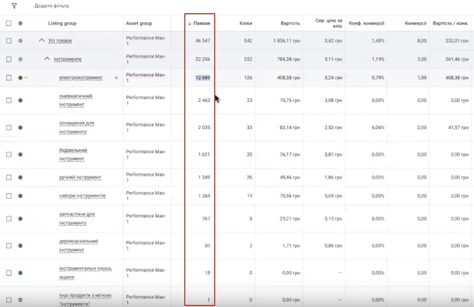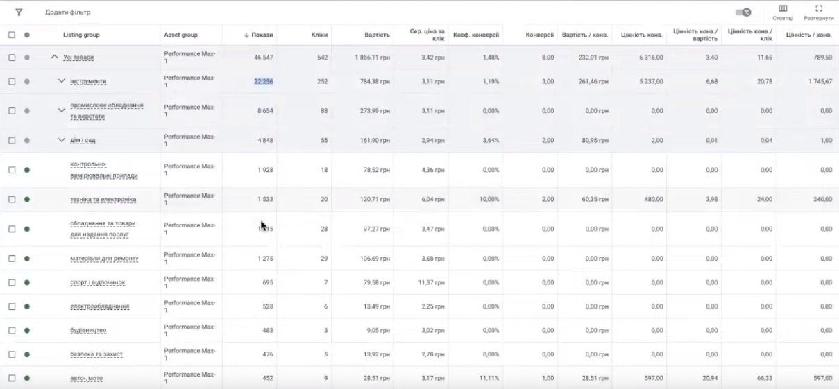 Є 320. Є взагалі 13000 грн. При цьому, якщо подивитися, щось з цього дуже активно показувалось. Взагалі ця категорія практично неробоча, що по 200 грн, що по 13 грн. та інше. Тому що оці 400 грн. Google не може ефективно розділити. Це частково, хоча б якось закрито в тематиці інструмента, і навіть електроінструмента, оці розділені покази, але їх також небагато. Тобто тут в основному причина буде того, що ви отримуєте дуже мало кліків, що ви назначили оту цільову CPA і назначили досить високий бюджет.