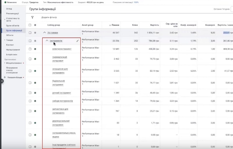 Якщо подивитися на цю, 1026 грн., перформанс, то не злив гроші нікуди. Давайте дивитись об’єктивно. Відкриваємо цей електроінструмент, там 400 грн. він витратив загалом. Одна конверсія 400 грн. – дуже дорого. Якщо ми подивимося потоварно, бачите 15, 14 грн., 10, 10. Тут дуже багато буде товарів, які там по 3 по 1,5 гривні витратили. Якщо такі будуть, ось 3 гривні. 3, один клік. Сказати, що перформанс взагалі не розуміє, кому таргетувати ваші товари – це буде абсолютно некоректно. Але нюанс оцей зберегти баланс між витратною частиною і результатом, який ви хочете отримувати – оце цінність роботи спеціаліста. Тому що перформанс тут непогано справився навіть з цим електроінструментом. Він розтягнув ці гроші по товарам. Давайте так, будемо об’єктивно, 15 грн. на один товар – це не така велика сума. Але, якщо ви хочете відразу певну окупність, певну результативність, то вам треба дати більше їм одночасно бюджету і перевестись на іншу стратегію ставок. Якщо ви хочете, наприклад, просто на конверсіях продовжити, підключаємо колтрекінг на менших бюджетах. Як я казала, запускаємося без обмеження, дивимося, яку ціну за конверсію він може віддати. Це дуже важливо. Чим дешевшу ціну за конверсію віддає – більшу статистику збираємо. Потім підключаємо це обмеження і збільшуємо бюджет. Отак 400 грн. Просто так на конверсіях от вам результат 232 грн. Це враховуйте.