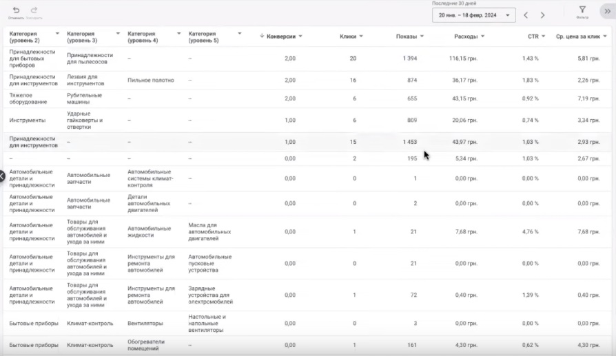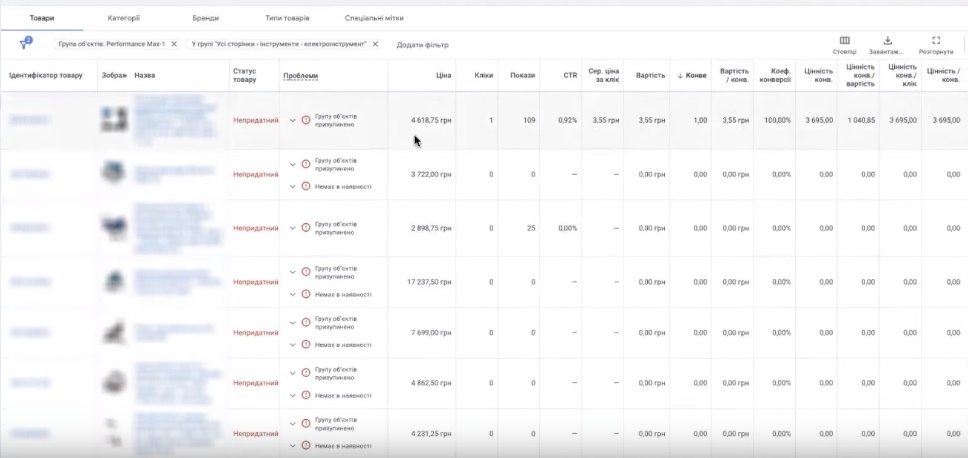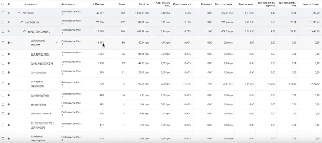 В нас є тут електроінструменти. Він резервує більшу суму під цю історію. Чи він може генерувати значну кількість конверсій? Як бачимо – ні. Тут слабкий коефіцієнт конверсій. Ціна за клік відносно до цього коефіцієнту конверсій досить висока. Вам потрібно враховувати цей нюанс, проаналізувати ще глибше свій товарний асортимент, подивитися що з цього… Ось бачите, шліфмашинки взагалі перетягують на себе якусь частину бюджету. Тут гайковерти ось зробили цю конверсію одну.