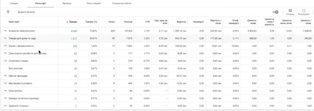 А мабуть буду дивитися не по типам товарів, а по категорії Гугла, тому що вони більш-менш щось там могли визначити правильно. Хоча є в «Мистецтво, хобі, рукоділля» у вас там Google product категорії також десь є невірні. Вам потрібно весь товар на асортимент передивитися. От, якщо я подивлюсь «апаратне забезпечення», ось наприклад, я тут зробила, тут не показується в розвертуванні. Я ось зробила такий звіт в редакторі звітів по категорії. Я ось що тут бачу? Є ось категорії, наприклад, які там отримали 1300 показів. Да? І навіть дві конверсії. Пилососи, ці принадлєжності для пилососів. Є ось, наприклад, масла взагалі нічого не отримали. Є ось категорії там, інструменти якісь, там 5000 показів. Ваша задача для того, щоб зрозуміти як їх між собою розкроїти ці рекламні кампанії не просто дивитися по типам товарів чи по категоріям, а дивитися по обобщонності цих категорій між собою, до чого вони належать по загальності для того, щоб Гуглу було зручніше розуміти кому показувати цей товар.