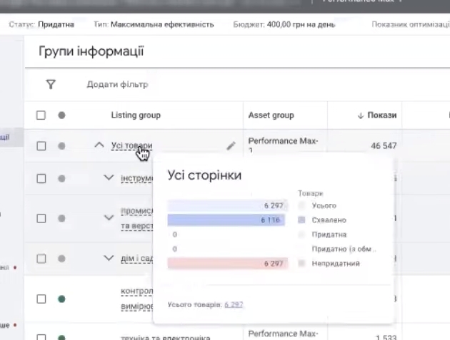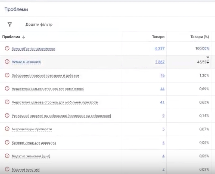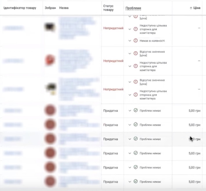 Звичайно, не всі ці товари в статусі «допущено до показів». Тому що тут пише «непридатний», бо група об’єктів «призупинено». Десь близько 45% товарів немає в наявності. Ну ми можемо прикинути, що десь близько там 3000 товарів точно може потенційно показуватись.