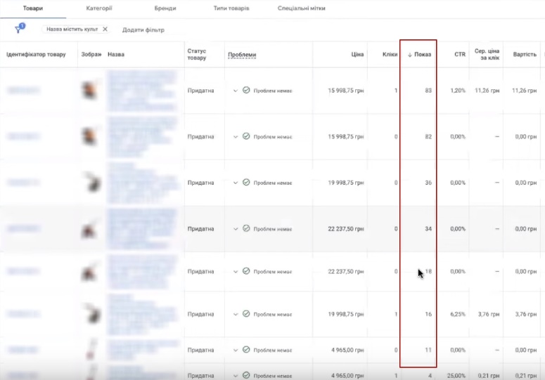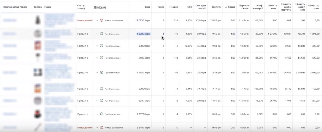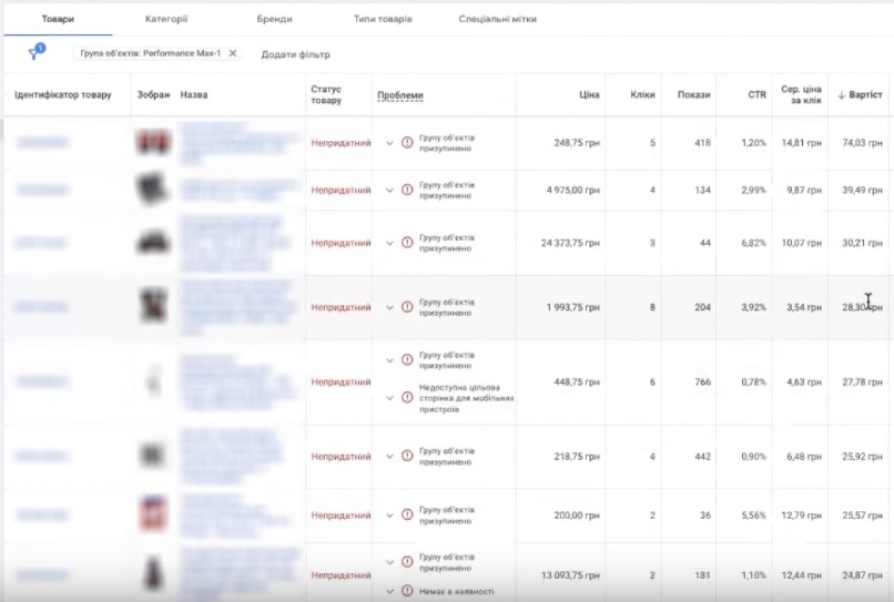 Ну більше, я не рекомендую, бо буде більший бюджет витрачатися. Можливо вас не обрадують ці кліки, які ви будете збирати. В принципі перформанс нормально адекватно розподіляє покази. Там нема товарів, які б от просто в себе вдули бюджет і все. Ось якщо взяти навіть по вартості. Я візьму цю групу об’єктів, бо я ж створила оту. Такс, йдемо в товари. Всі товари. Ось дивіться, нема жодної товарної позиції, яка б там, наприклад, 700 грн., 300 грн, там 150, 120 грн.