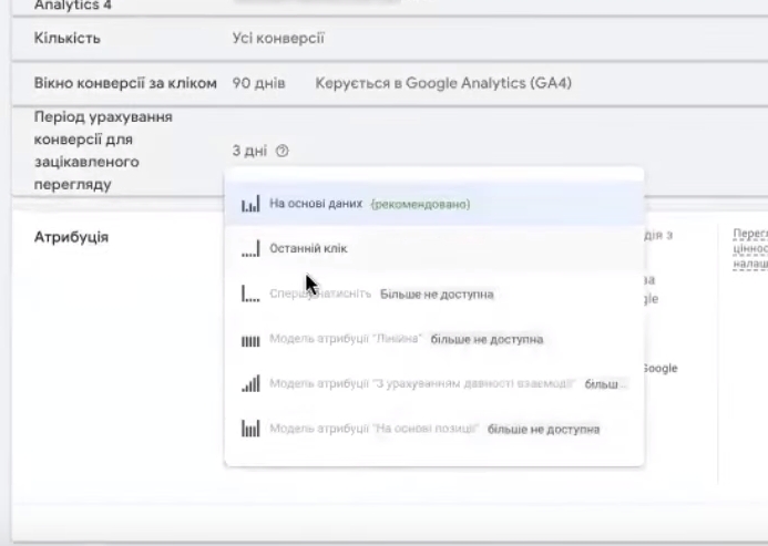 Наступне, якщо у вас в акаунті менше 200 чи навіть 500 конверсій за місяць, то ваша модель атрибуції не на основі даних, а покупка. Ой покупка… Боже, останній клік. Я вже заговорилася. Останній клік. Тобто на цій новоствореній конверсії ви виберете останній клік.