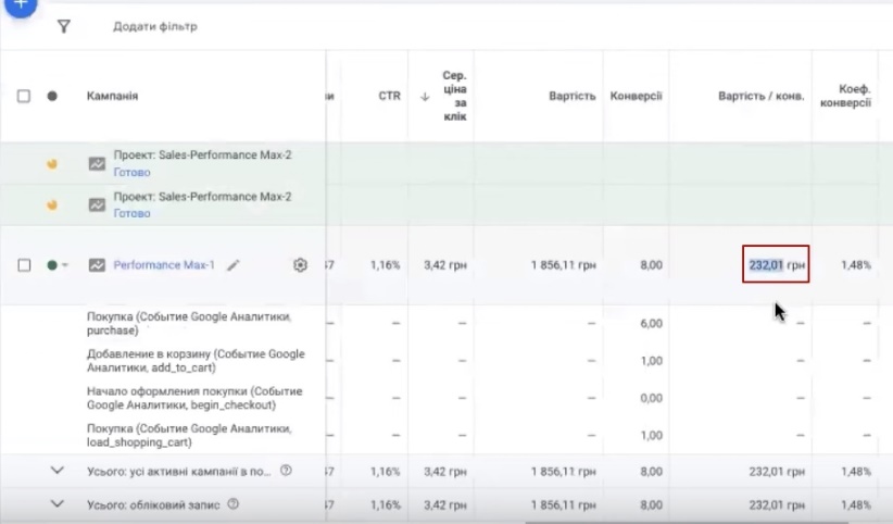 Якщо ви хотіли таку цільову CPA, ваш стартовий бюджет повинен бути, ну я не знаю, там в розмірі 60 грн., не більше, якщо ви хотіли. Але все рівно у вас би не вийшло. Вам потрібно сюди динамічний колтрекінг, телефонні дзвінки. Вони би розбавили цю грусну картинку і у вас би получилось ті самі 60 грн. А так ви продублювали ще купу конверсій, те саме add_to_cart сюди вліпили і все рівно, воно не виходить. Чистова аналітика по правильним конверсіям потім з цим можна працювати. Цільову CPA я не рекомендую задавати. Подивіться на структуру ваших товарів. Спробуйте їх розділити хоча би на два, на три перформанса. Не більше не треба, там не 10, не 20. От ваше домашнє завдання буде згрупувати товарний асортимент на кучки, на три штуки отаких кучок. Чим вони обобщоні? Чим вони схожі? От запустити три перформанси, стартувати наприклад з бюджету, я не знаю, там грн. 100, 120 десь так, можна 200-300 назначити і задати рентабельність для них.