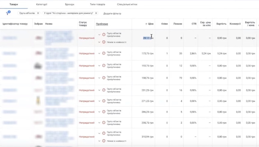 Є, наприклад, товари, там вироби з металу, вантажівки, автобуси. Бачите, дуже мало показів. Тут навіть чомусь є «Краса та здоров’я» категорія цього магазину. «Вагнер», не знаю для чого це. «Клейовий видавлювач». Я би вам рекомендувала, дуже щепітільно переглянути ваші типи товарів. Тому що типи товару беруть участь у таргетингу. Тому краса тут мало чим пов’язана з вашим електроінструментом.