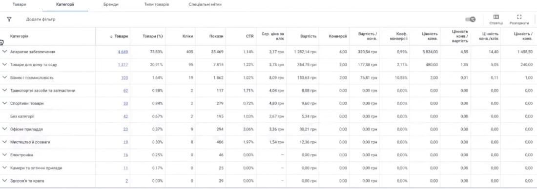 Є категорії, які отримують покази, а які не отримують. Якщо наша задача збільшити кількість трафіку, тобто якщо ми розглядаємо просто тупий примітивний формат збільшити кількість трафіку, то, як мінімум, треба або збільшувати розмір бюджету і не зажимати оцю цільову ціну за конверсію. Тобто її зробити вищою. В нашому випадку вона досить висока – 232 грн. Або ставити на рентабельності. Або вицепляти ось якісь категорії товарів, які взагалі не отримали показів, або отримували відносно інших значно меншу кількість. Це не значить, що кожний розділ оцієї категорії треба виділити в окрему кампанію.