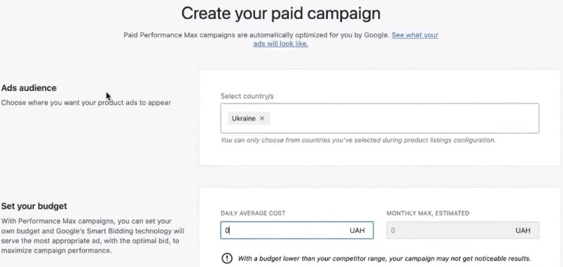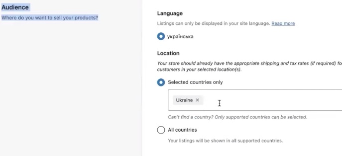 Блок “Аудиторія”. Важливо виділити цьому час. Ваші налаштування. Мова тут безпосередньо береться з мови сайту. Вона переведеться на англійську. У цьому випадку українська стоїть, тому можете обрати українську та відповідні країни. На що це впливає? Вплине на налаштування Перформанс Макса в майбутньому, але й на налаштування фіда Мерчант Центру. Не клікайте що-небудь, виберіть конкретно країну, конкретно мову і, відповідно, йдіть далі.