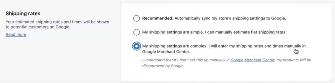 Далі – “Shipping rates”. Що таке Shipping rates? Це налаштування доставки, що довантажаться у фід Мерчант-центру плюс, можливо, у налаштування Мерчант-центру. Що з пунктів обирати? Домовимося, якщо запускаєте інтернет-магазин в Україні, то бажано вибрати такий пункт під назвою “My shipping settings are complex. I will enter my shipping rates and times manually in Google Merchant Center”, вручну введете всі налаштування.