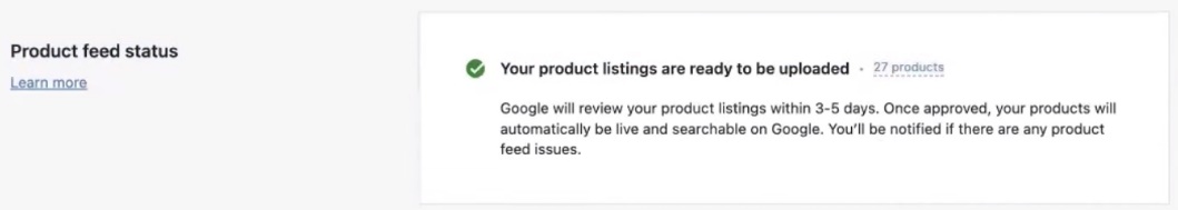 Спочатку в “Product feed status”, у продуктовому фіді буде вказано, що продуктовий лістинг готовий до завантаження і покаже, що всього 27 товарів є. Не особливо багато, це шаблонний сайт.