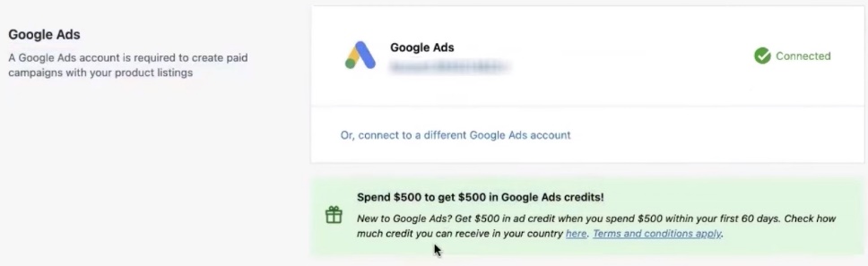 Далі потрібно приконнектити обов’язково Google Ads. Якби вже був рекламний акаунт Google Ads з тієї пошти, під якою логінилася на етапі налаштування акаунтів, то знову б запропонувало вибрати існуючий. Його немає, буду створювати. Натисну “Create account” і він створить рекламний акаунт. Бачите, пропонує 500 доларів витратити й отримати 500 доларів кредиту.