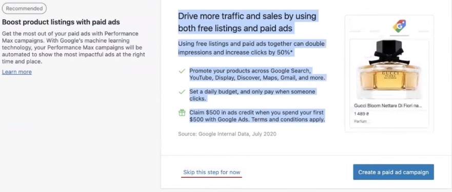 Йдемо далі. Можемо з цього етапу створювати рекламні кампанії, а можемо пропустити. Пропоную пропустити, якщо ще не перевірений, безпосередньо, Мерчант Центр. Натискаю “Skip this step”, тому що показуватиму альтернативний варіант створення Перформанс Макса, коли не потрібно поспішати, у Мерчант Центрі все чудово, налаштовані всі конверсії. Після можна вже створювати Перформанс Макси. Інакше на цьому етапі це абсолютно не має сенсу. “Mayby later” і все.