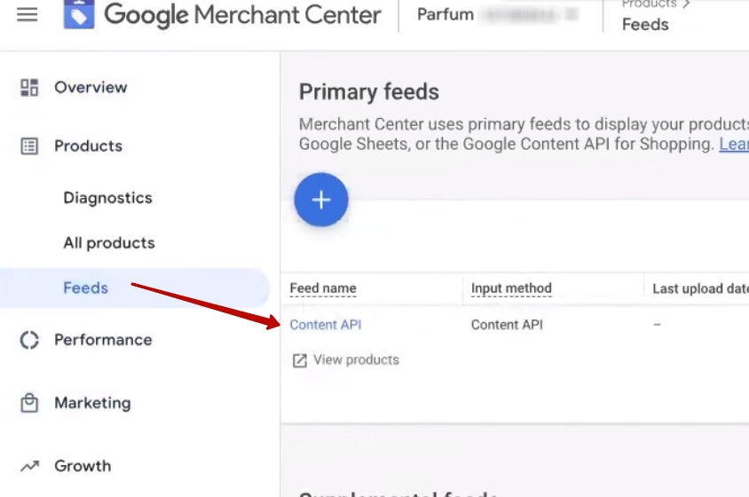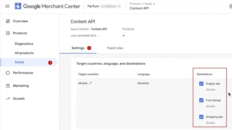 Тут просто кілька Мерчант центрів. Заходжу в Parfum. Бачите, тут що є? Якщо зайду на вкладку продукти у фіди – побачу, що з’явився фід під назвою “Content API”.