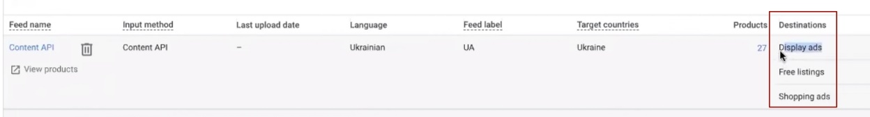 Видно, що є три програми, одразу ввімкнено “Display ads” (динамічний ремаркетинг), “Free listings” і “Shopping ads”. Просто клікнули цю кнопку і вже підключилася платна програма. Чому на цьому акцентую увагу? Можна для початку перевірку Мерчант центру пройти на фрі-лістингу і потім додати платну рекламу.