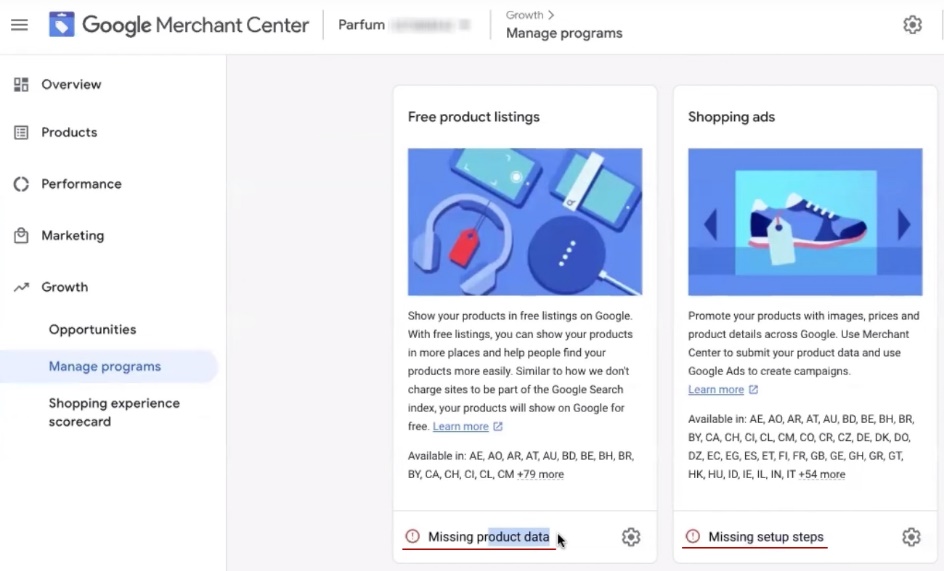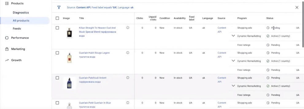 Зараз на даному етапі маємо Мерчант-Центр, де заведена бізнес-інформація, інформація про доставку і завантажені товари. Усе. І ввімкнено три програми: динамічний ремаркетинг, фрі-лістинг і платні оголошення. Якщо не увімкнулося – заходьте в блок Growth, називається “Керування програмами” і обираєте.