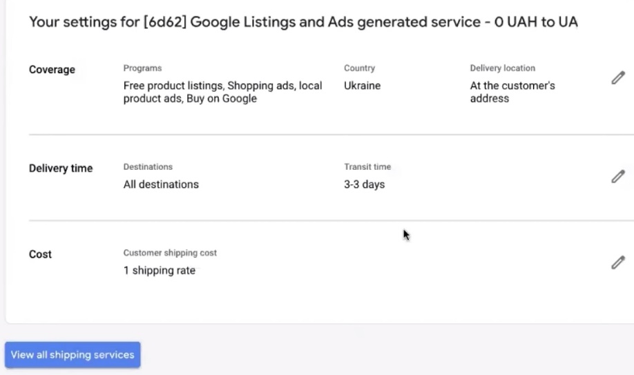 Обов’язково заходжу в блок і дивлюся що задано. Минулого разу сказала, що буде безплатно, то приблизно така сама ситуація має бути. Якщо потрібно щось переробити, припустимо, потрібно обчислити доставку, виходячи з вартості замовлення. Виберете вагу, то потрібно вантажити додатковий атрибут у фід. Тут його немає. Або число продукту. Усе заповнюєте. Якщо немає доставки або ще чогось – заповнюєте виходячи із заведеного на сайті. Важливо, щоб інформація повністю збігалася з тим, що прописали в політиці доставки або умовах доставки.