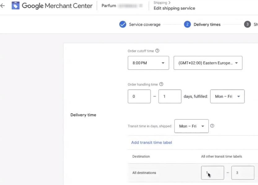 Потрібно обов’язково вказати час, до якого обробляєте замовлення. Цю ж інформацію обов’язково потрібно продублювати на сайті в розділі “Політика доставки”. Припустимо, Київ. Вибираю що до 8 вечора. Далі обов’язково заповнюєте час обробки замовлення. Час обробки, не доставки! До моменту відвантаження товару службі доставки. Припустимо, обробляєте замовлення цілодобово – можете писати 0-0. Коли ж до 8 вечора або до 4 вечора приймаю замовлення і наступного дня, що пізніше прийшло, обробляю, відправляю. Виставляю 0-1. Понеділок неділя або субота самостійно виставляєте виходячи з графіка роботи. І Transit time. 1-3 дні, зазначено. Можете задати навпаки, 2-3 дні, залежно від параметрів.