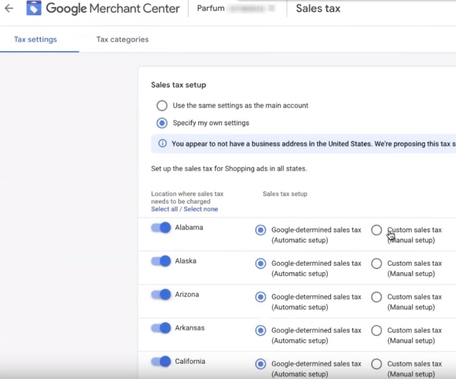 Далі – податки. Є сенс заводити лише в єдиній країні. Єдина країна – це Штати. Тут, як хочете. Можна використовувати якусь універсальну, задати власні. Припустимо, вибрати Штати, перемикаюся на розширені налаштування. Вибираю всі штати і задаєте вручну такси або автоматично система їх розраховує. Як зручно. Податків немає – це не заповнюю.