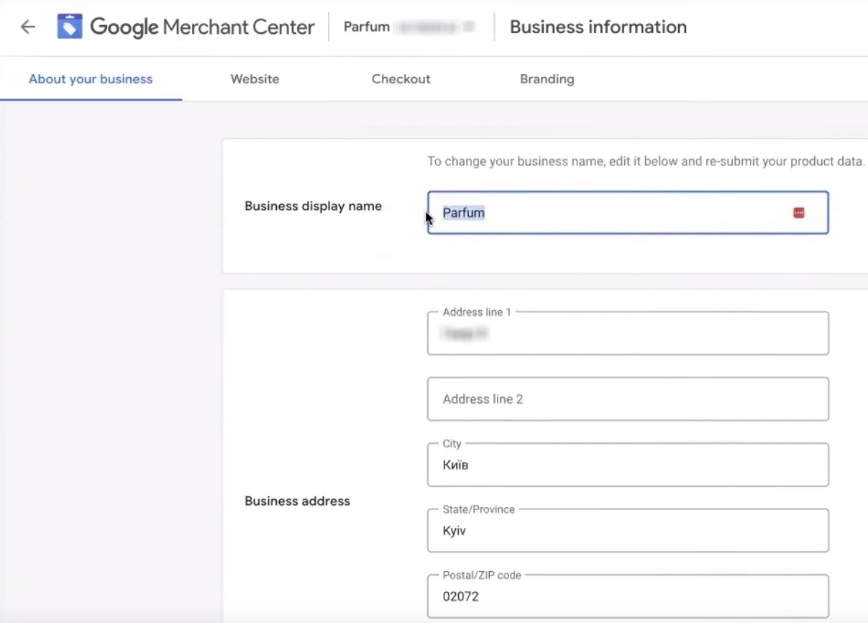 Далі блок, що потрібно обов’язково перевірити – інформація про бізнес. Обов’язково перевіряємо, щоб назва магазину була або доменним ім’ям, або щоб писалася в назві домену, в логотипах на сайті. Далі обов’язково перевіряєте адресу. Пам’ятайте тільки що Київ – окремий регіон. Тут не задається Київська область. Адреса має повністю збігатися з тією, що на сайті. Те що заводили на попередньому етапі, але перевірте ще раз. Те ж саме стосується телефону. Цей блок можна заповнювати або не заповнювати. Краще щоб його заповнили. Упущу, це не принципово важливо.