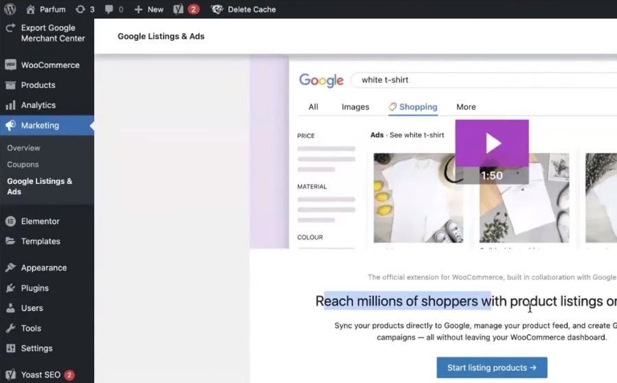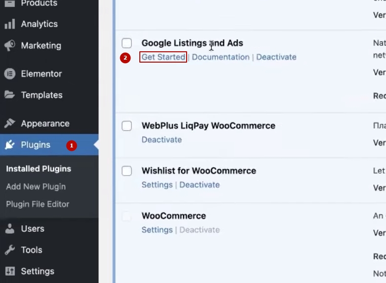 Йдемо в “Плагіни”, в “Встановлені плагіни”, шукаємо Google Listings & Ads, натискаємо “Get Started” (почати) і почнеться найцікавіше.
