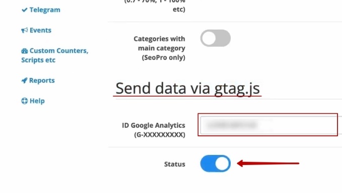 Вставляємо. І обов’язково ще нам потрібно скопіювати оцей номер аналітики. Копіюємо його. Ідемо в цей другий блок налаштування Google Ecommerce GA4. Спускаємося от сюди. Send data via Gtag.js. Вставляємо і включаємо. Після цього обов’язково нажимаємо «Зберегти».