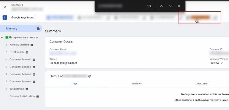 Знову заходжу в свій Tag Manager. Нажимаю передперегляд, шукаю цей тег. Ось він у мене є.