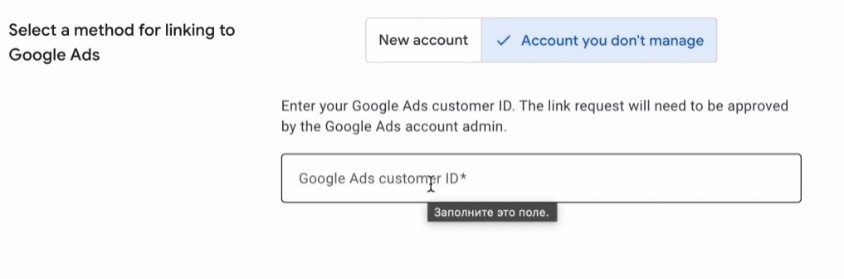 Ми будемо робити з вами новий кабінет, хоча ви можете пов’язати з старим якимсь кабінетом, якщо ви раніше його зробили. Тоді ви заходите в свій Google Ads профіль, берете 10 цифр, які у вас справа вверху над е-мейлом, вставляєте в це поле і нажимаєте «Відправити запит». Потім в рекламному кабінеті ви схвалюєте цей запит окремо. Можна так зв’язати, нічого критичного не буде.