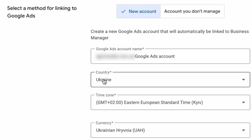 Уважно дивіться. Валюту ви потім не зміните в рекламному кабінеті, тому визначтеся, в якій валюті ви будете оплачувати кабінет. Даю вам базову рекомендацію – валюта і країна рекламного кабінету повинні, в ідеалі, сходитися з країною, валютою того банка фізичного, за допомогою якого ви будете здійснювати платежі. Якщо ви, наприклад, сидите фізично в Латвії, Естонії і у вас є карточки кредитні, реальні, не віртуальні, це дуже важливо, інакше там можна напоротися на блокування з Google Ads-а, така в нього політика, не важливо. У вас є карточка цього банку, то краще все обрати відповідно до країни банківської карточки, з якої ви будете оплачувати. Якщо ж у вас Україна, як у мене, тут гривня, карточка гривня, можна це залишити. Якщо ж в Штатах знаходитесь, інше, – обираєте обов’язково країну рекламного акаунту, валюта, відповідно до вашого методу платіжного. Плюс країну її ви ніяк не поміняєте і валюту ви не поміняєте. Доведеться створювати новий кабінет. Навіщо заморочувати над цим? Робимо зв’язку, Link.