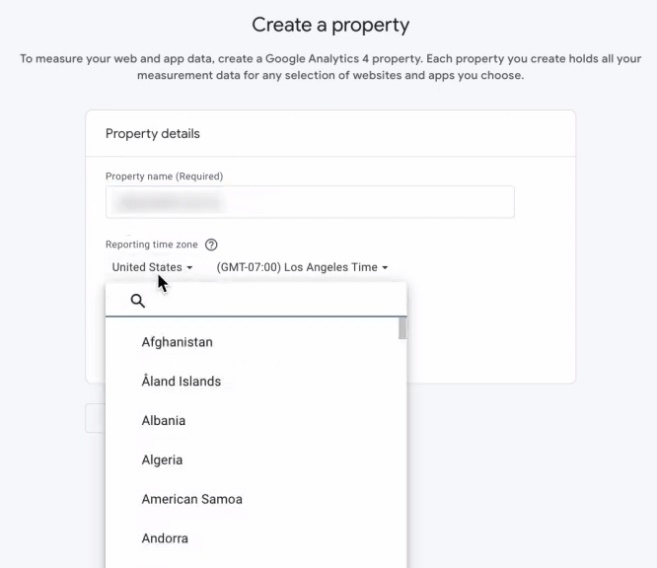 Далі те саме для робимо для property нашого. Потім обираєте країну, в якій ви будете налаштовувати ваші продажі. Наприклад, в мене це може бути Україна. Обираєте час. Якщо це Штати, ви обираєте Штати, часовий пояс.