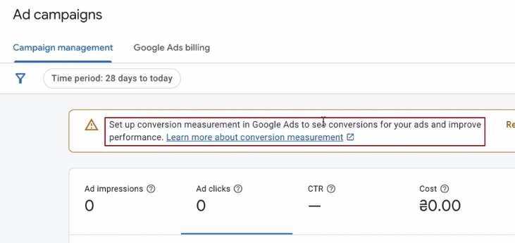 Ми зараз будемо налаштовувати з вами конверсії. Це обов’язково. Без цього наші Пмакс-и не будуть працювати. Для цього ми переходимо в наш рекламний кабінет. Все дуже зручно зробили. Дякувати гуглерам, нарешті вони роблять все чудово, все прекрасно Навіть тут він пише «Налаштуйте відслідковування конверсій в вашому Google Ads, щоб бачити ваші конверсії і покращувати ефективність».