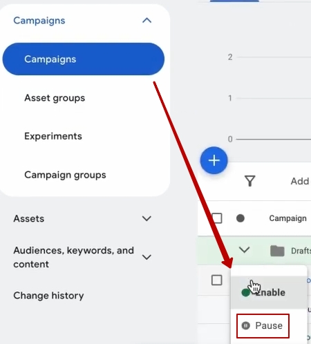 Я закриваю гайд, відразу переводить на налаштування конверсій. Це буде зараз найцікавіше. Перед тим, як ми будемо налаштовувати конверсії, ми ж створили з вами рекламний кабінет. Не впевнена, який метод оплати ви обрали. Тому ми заходимо в розділ «Кампанії» і поки що призупиняємо цю кампанію, тому що вона в нас була тестова, без важливих налаштувань, тому призупинили, впевнені, що в нас нічого не витрачається в коштах і собі спокійненько налаштовуємо цілі.