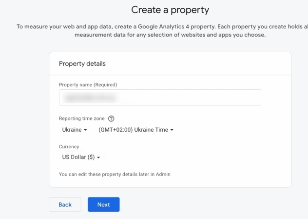 Чому я рекомендую вписувати доменне ім’я? Тому що, якщо у вас буде декілька сайтів або тут будуть піддомени, або ще щось – ви будете собі придумувати, все рівно, таким чином вам буде зручно шукати в пошуку свій відповідний профіль четвертої аналітики. Тому що раніше можна було по ідентифікатору аналітики все шукати, але Google чомусь його прибрав. Тому по назві доменного імені, зазвичай, у вас буде порядок. Зрозуміло, де який акаунт лежить.