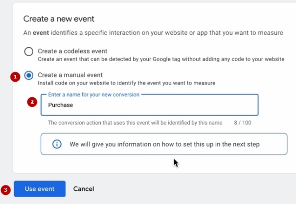 Нам треба codeless. Ні – manual event. І ми називаємо його «Purchase». Кожного разу вони міняють цей інтерфейс. Use event purchase. Save. Продовжити.