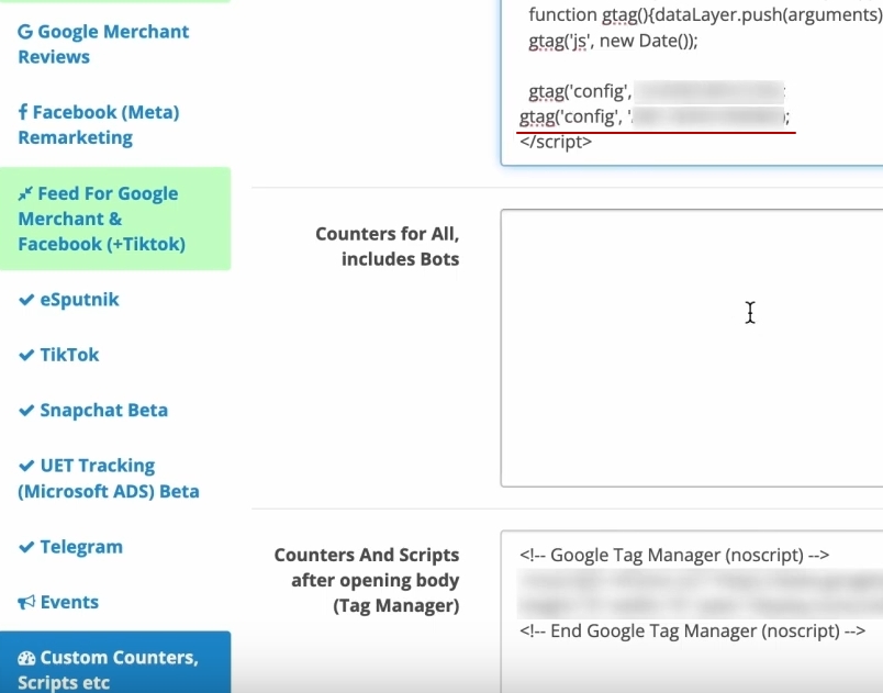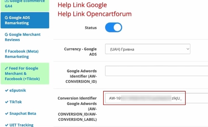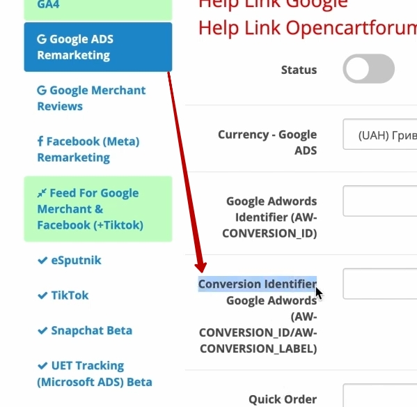 Повертаємося в наш OpenCart, обов’язково. Ідемо в ось оцей блок, який називається Google ADS remarketing. І в нас тут буде дуже цікава історія. Нам відразу запропонується поставити мітку для нашого кода Google Ads-а для відслідковування конверсій. Що ми для цього зробимо? Ось у нас блок, який називається «Conversion Identifier».
