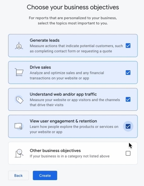 Далі нам пропонується обрати категорію бізнесу нашого. Можна обрати шопінг і не паритись, якщо хочете, можете обрати щось інше. Для чого це потрібно? Ні на що в четвертій аналітиці, особливо, це не впливає, тому не супер критично, якщо ви щось там десь помилитеся. Обираємо оці всі чотири галочки. П’яту ви не оберете, тому що вона, ось бачите, виключає ці.