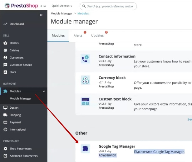Що для цього потрібно буде? Нам потрібно буде встановити ось цей модуль, який в мене називається Google Tag Manager. Знову таки, якщо він вам потрібен, ви можете написати мені. Вам скажу як його поставити або ви можете самостійно тут придбати модуль, або знайти якусь аналогічну річ. Він у мене вже інтегрований. І він у мене вже поставлений, як ви бачите. Ось він. Google Tag Manager є.