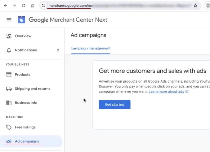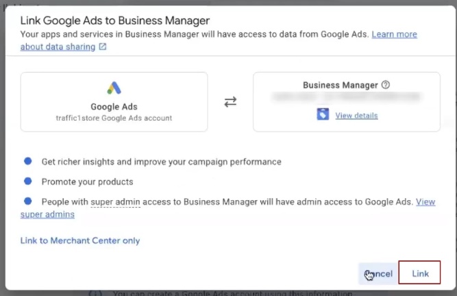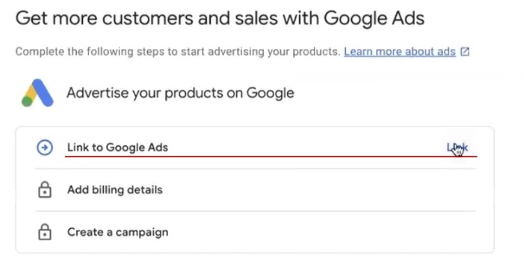 Якщо ми хочемо створити з Мерчант центра, ми переходимо в наш Merchant Center і нажимаємо «Get started». Після того як ми нажали «Get started», нам запропонує відразу заповнити певні налаштування. Тобто, зв’язати з нашим Google Ads. Ми нажимаємо «Link».