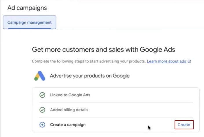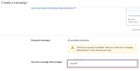 Далі ми можемо створювати кампанію. Ідемо в «Create a campaign». І що ми тут будемо робити? Це мій найулюбленіший варіант. Ми зараз дуже швиденько створимо. Чому люблю варіант створення рекламного акаунту і кампанії через Merchant Center? Тому що він ну дуже супер ідеальний, дуже легкий і дуже простий. Ми тут можемо задати відразу бюджет, який вас там влаштовує. Задам еквівалент приблизно 10 доларів. Ідемо далі. Все.