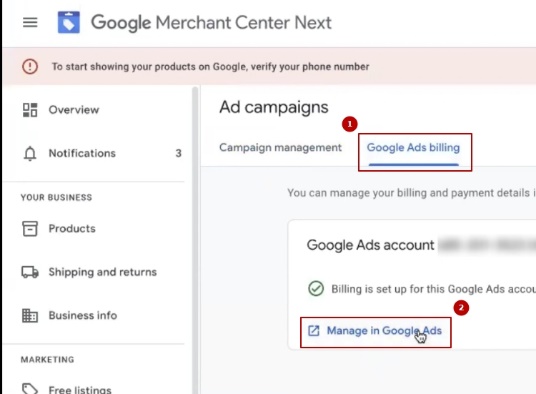 Тепер нам що потрібно буде зробити? Нам потрібно буде перейти в наш рекламний акаунт. Як це можна зробити? Ми можемо перейти на вкладочку Google Ads billing і нажати Manage in Google Ads.