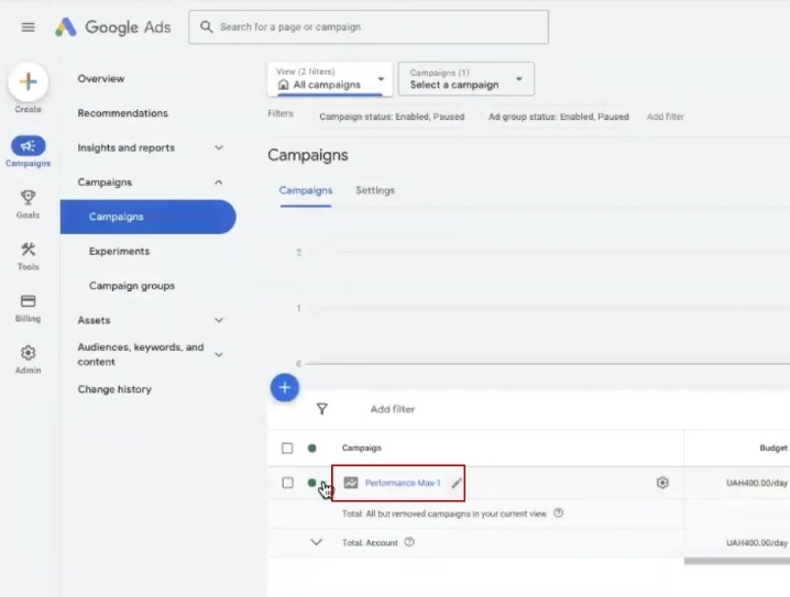 Відкривається віконечко Google Ads-а. Ми доактивували наш акаунт. Далі. Заходжу в свій Google Ads. Вже бачу мою кампанію, але ми зараз її призупиняємо.