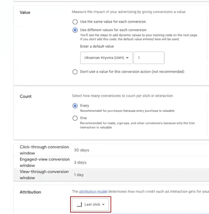 Тут проставляєте всі налаштування, як у мене. Єдине, що особисто надаю перевагу «Last click». Але ви можете вибрати свою.