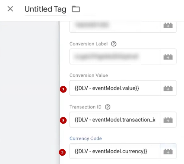 Вставляємо наш Conversion ID, який ми скопіювали на попередньому етапі. Повертаємося до мітки. Копіюємо сюди мітку і нам потрібно буде зараз задавати оці всі параметри.