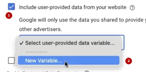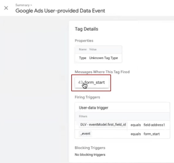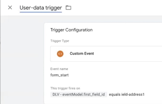 Ми зараз будемо окремо відправляти User datа, щоб система на нас не сварилася, що в нас її немає. Вибираємо «User-provided Data». Обов’язково беремо наш Conversion ID. Інакше вона не зрозуміє куди відправляти ці всі дані. Нам треба взяти нашу перемінну. Не забудьте, будь ласка, про Consent мод, якщо він вам потрібен. І зараз ми будемо вибирати тригер. Беру Custom Event. Event у мене називається «form_start». Так, і мені потрібно, щоб вона відпрацьовувала, коли в мене є певне значення «first_field_id». Нову перемінну роблю Data Layer, eventModel, first_field_id. Зберігаю. І мені треба, щоб вона «field-adress1». «User-data trigger» і зберігаємо.