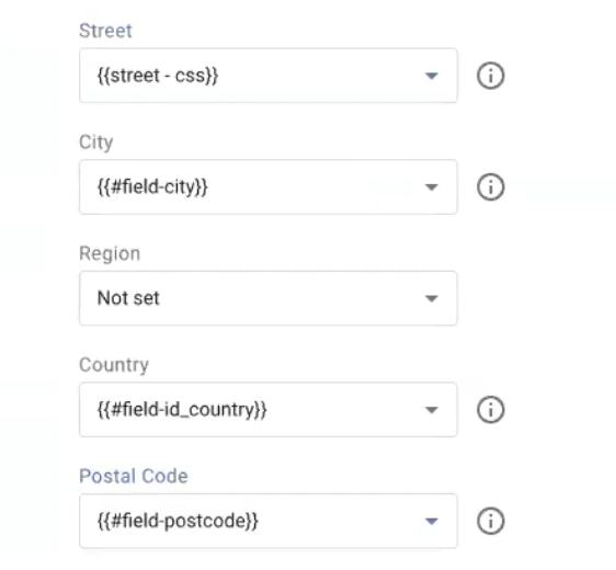Тут телефона немає, але ви можете замість телефона таким чином завести інші дані. Наприклад, мені тут нічого не потрібно. «Continue». First, VAT number, Address. І ось пішли-поїхали. Ми можемо сюди адресу взяти таким самим чином. «Copy selector». Так, це в нас телефон. У нас телефона немає. Ми берем «Street» – «New variable…». Зараз мабуть це призупиню відео. Заповню це все і потім продовжимо.