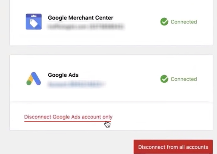 Що для цього потрібно? Потрібно відкрити рекламний акаунт Google Ads і дозавершити кілька налаштувань. Якщо пам’ятаєте, на етапі коли встановлювали плагін під назвою Google Listings & Ads, у налаштуваннях підтверджували зв’язку з рекламним акаунтом Google Ads. Тут зараз довантажиться, зараз покажу повну інформацію. Тут ще пише “Disconnected”.