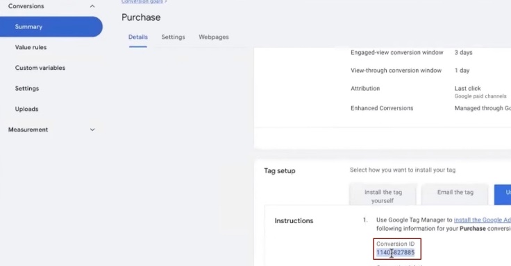 Натискаємо на цю конверсію, йдемо в налаштування, йдемо в Tag Manager. Conversion ID копіюємо,