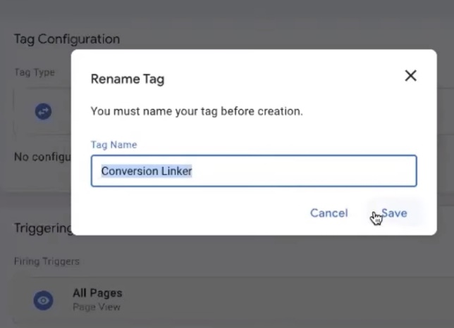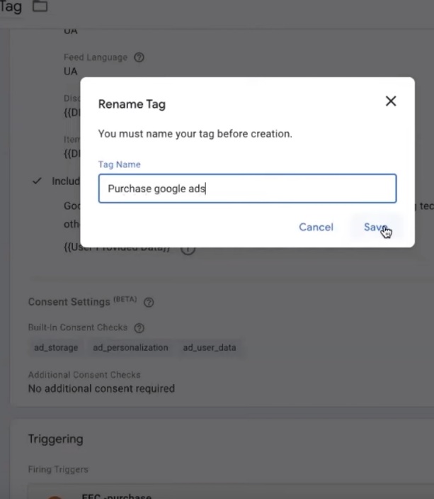 Далі потрібно зберегти цю конверсію, tracking. Можу назвати “Purchase Google Ads”. Зберігаю.