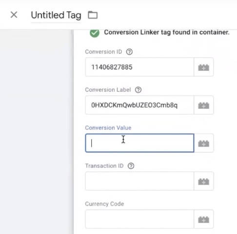 Це важливий блок для появи зеленої галочки. Вставляємо Conversion ID, повертаємося в Google Ads, копіюємо нашу мітку конверсії, вставляємо сюди. Тут потрібно вибрати value (дохід), що з’явиться. Потрібно вибрати обов’язково ID транзакції, currency пішло-поїхало.